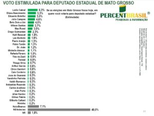 A mais recente pesquisa divulgada pelo instituto Percent Brasil trouxe os primeiros números da corrida por uma vaga na Assembleia Legislativa de Mato Grosso entre eleitores da Baixada Cuiabana e já desenha um cenário competitivo, fragmentado e ainda longe de qualquer consolidação definitiva.